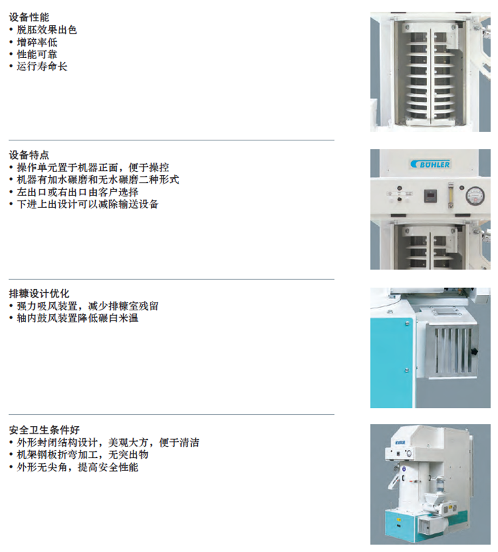產品適用於短粒精製大米碾米工藝,脫胚效率高,米表面修復好,是獲得高質量大米的完美設備,設備製作